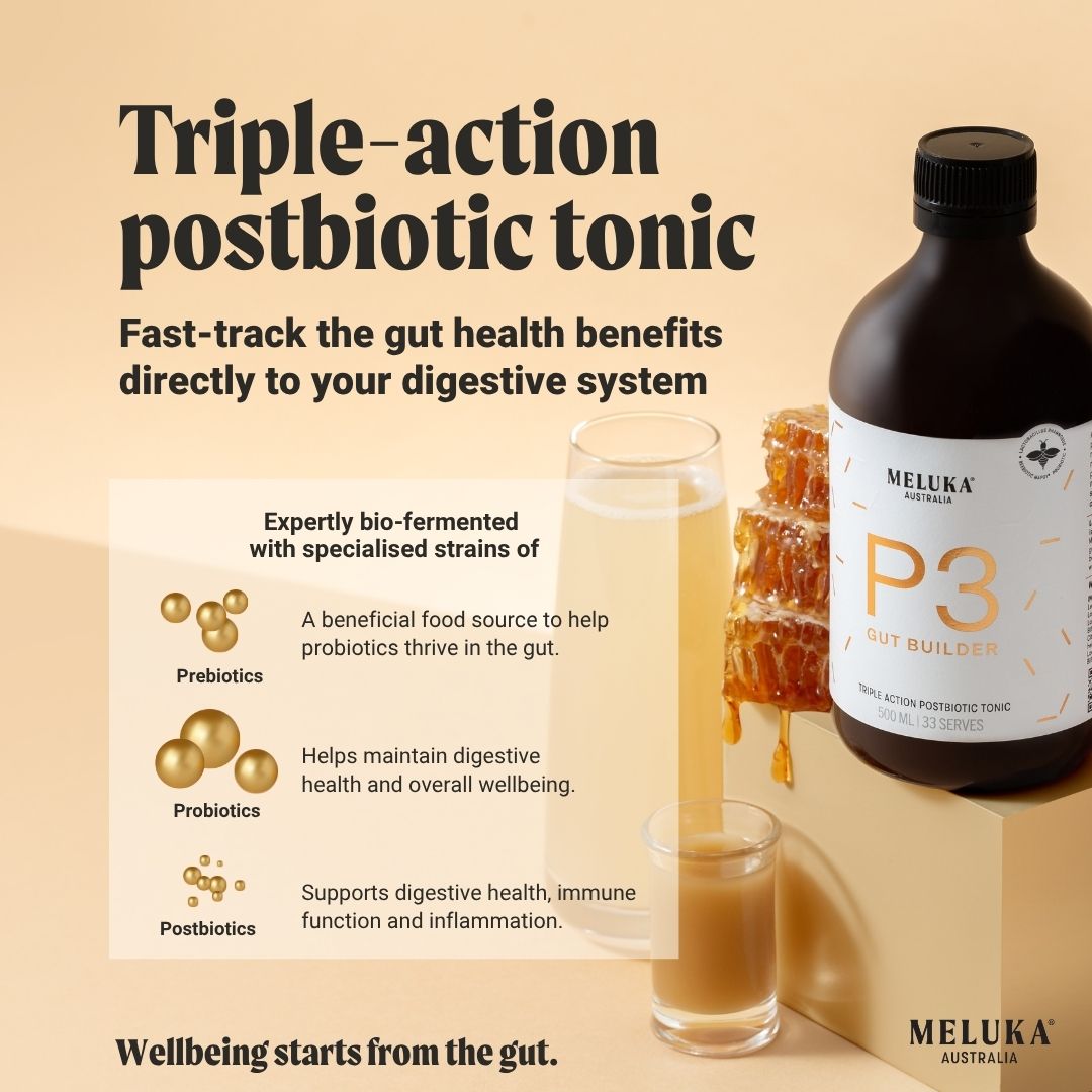 Build a healthy gut microbiome with P3 Gut Builder. A triple-action Postbiotic Tonic made from a slow-fermented process combining a specially selected combination of prebiotics, raw honey & inulin, our Lactobacillus rhamnosus Beebiotic MAP01® probiotic strain, plus 7 multi-strain probiotics and 2 postbiotic strains.