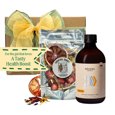 Make it a jolly gut-mas with our tasty new Gut Starter Raw Honey Postbiotic Tonic in Lemon flavour and our Meluka Mix of Cocktail Candy. This is the perfect gift for creating delicious gut-healthy spritzers and mocktails all summer long.